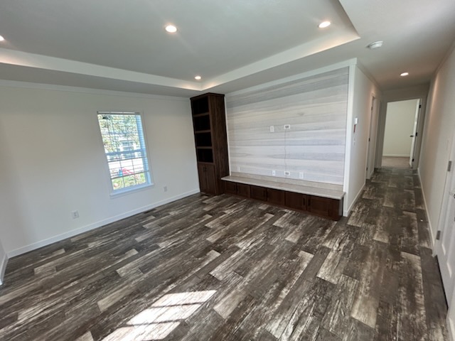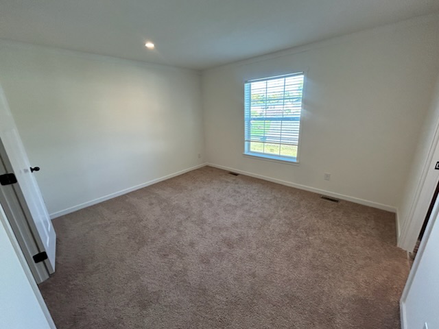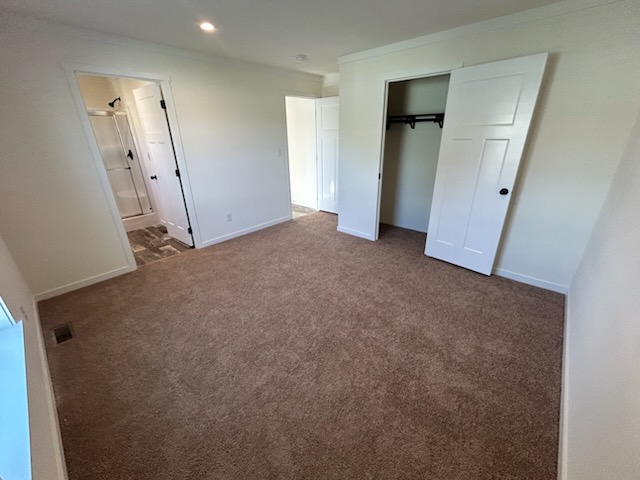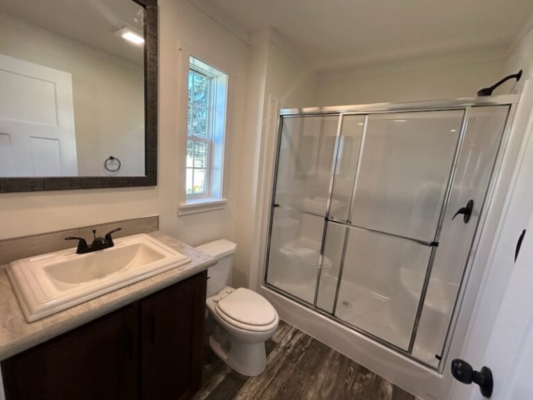 The primary bedroom is located at one end of the home, providing privacy from the other bedrooms. It’s spacious enough for a queen or king bed, with additional room for nightstands and a dresser. The attached en-suite bathroom includes a full tub/shower, a vanity with storage, and a toilet, creating a comfortable private retreat.