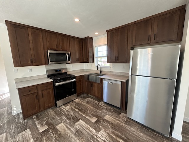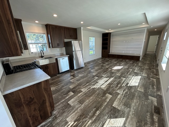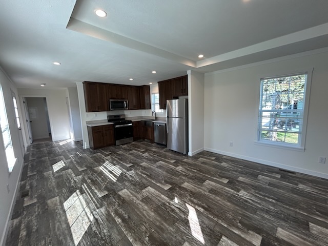 The kitchen is designed with efficiency and style in mind, offering generous counter space, ample upper and lower cabinetry, a deep farmhouse-style sink, and modern lighting. It’s well-suited for everything from quick meals to full family dinners.